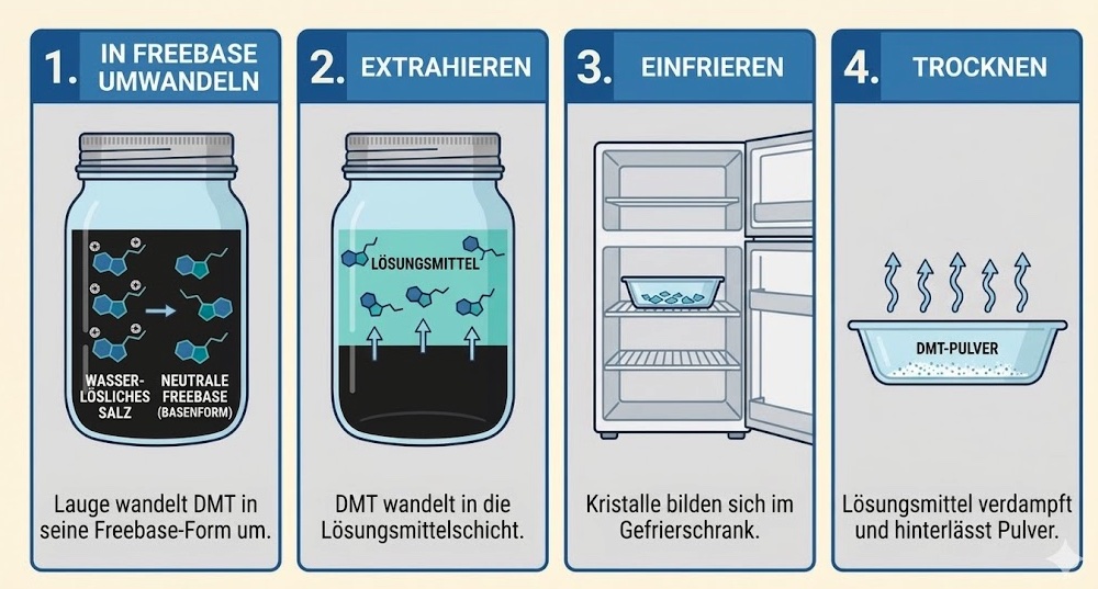 Die vier Phasen der Extraktion: DMT in Freebase umwandeln, in Lösungsmittel ziehen, ausfrieren und trocknen.