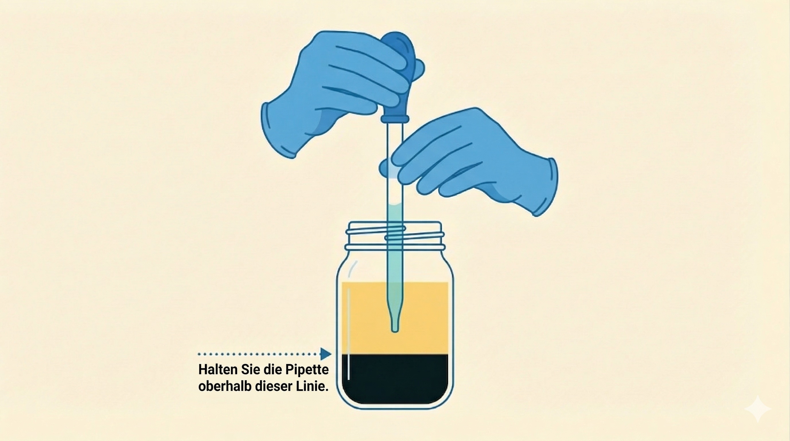 Verwendung der Pipette: Drücken Sie den Saugballen oben zusammen, tauchen Sie die Spitze in die klare Lösungsmittelschicht (bleiben Sie deutlich über der dunklen unteren Schicht) und lassen Sie den Ballen langsam los, um die Flüssigkeit aufzusaugen. Arbeiten Sie in mehreren kleinen Durchgängen, anstatt zu versuchen, alles auf einmal zu erwischen.
