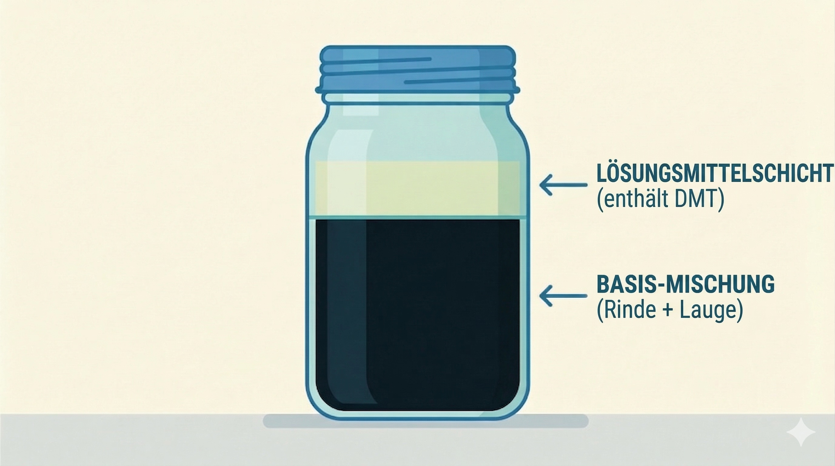 Zwei saubere Schichten: Das klare Lösungsmittel oben enthält nun das gelöste DMT. Die dunkle Basismischung befindet sich darunter.