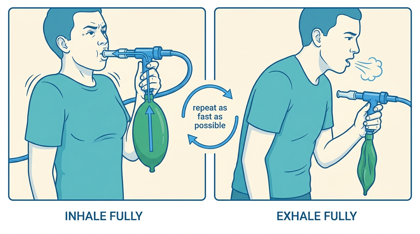 Inhale fully, exhale fully, repeat as fast as you can — the same cycle applies whether you're breathing through a mouthpiece or a sealed mask.