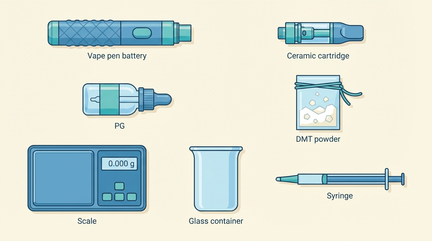 You need seven things. Most can be ordered online and arrive within a few days. Everything except the DMT is standard, legal vaping equipment. You don't need to mention DMT when buying. Vape shops (online or in-person), Amazon, and eBay all carry these items.