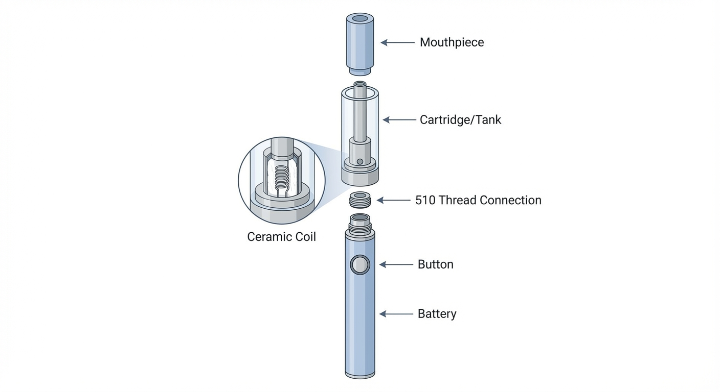 Option A: Buy a disposable pen or pre-filled cartridge. These are ready to use out of the box — no mixing required. A disposable pen is a complete device. A pre-filled cartridge screws onto a battery, typically a 510-thread battery (explained below).
