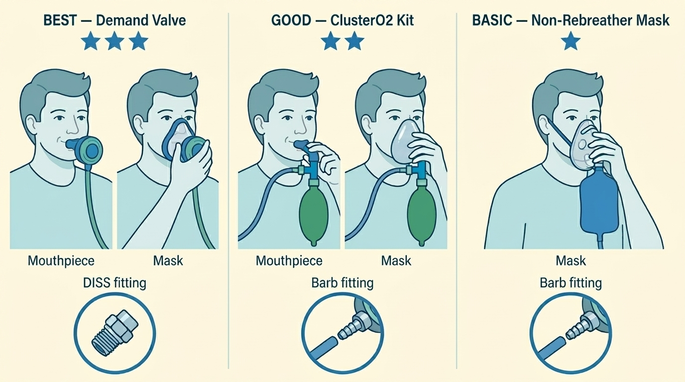 The three delivery options compared. The demand valve and ClusterO2 kit can be used with either a mouthpiece or a sealed mask. The non-rebreather mask typically isn't sealed: It has either side valves or sides holes to let out the air you breath out. It is recommended to close off side holes to prevent outside air from mixing with pure O2. Insets show the connector type each option requires on the regulator: a DISS fitting for the demand valve, or a barb fitting for the ClusterO2 kit and NRB.