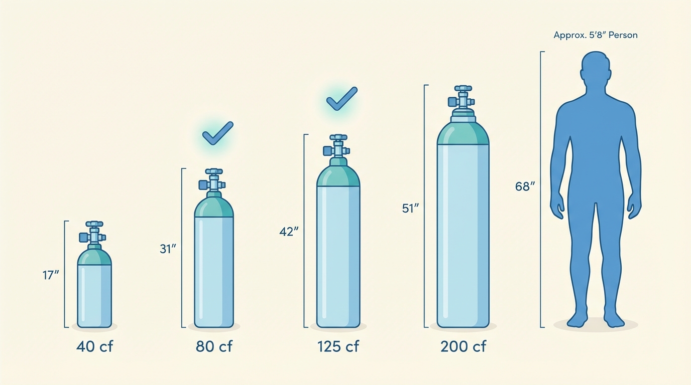 Cylinder size comparison. The 80 and 125 cf sizes are the most popular for home use. The 200 cf holds far more gas but requires a cart for transport.