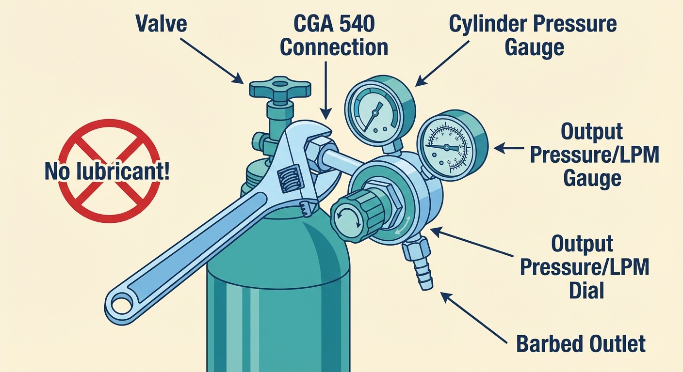 Attach the regulator to the CGA 540 valve. Hand-tighten first, then snug with an adjustable (crescent) wrench, firm but not forceful; stop when resistance increases and you can't easily turn further. The connection is metal-to-metal: no tape, no sealant, no grease. Do not use any lubricant: oil or grease near high-pressure oxygen is a fire and explosion hazard.