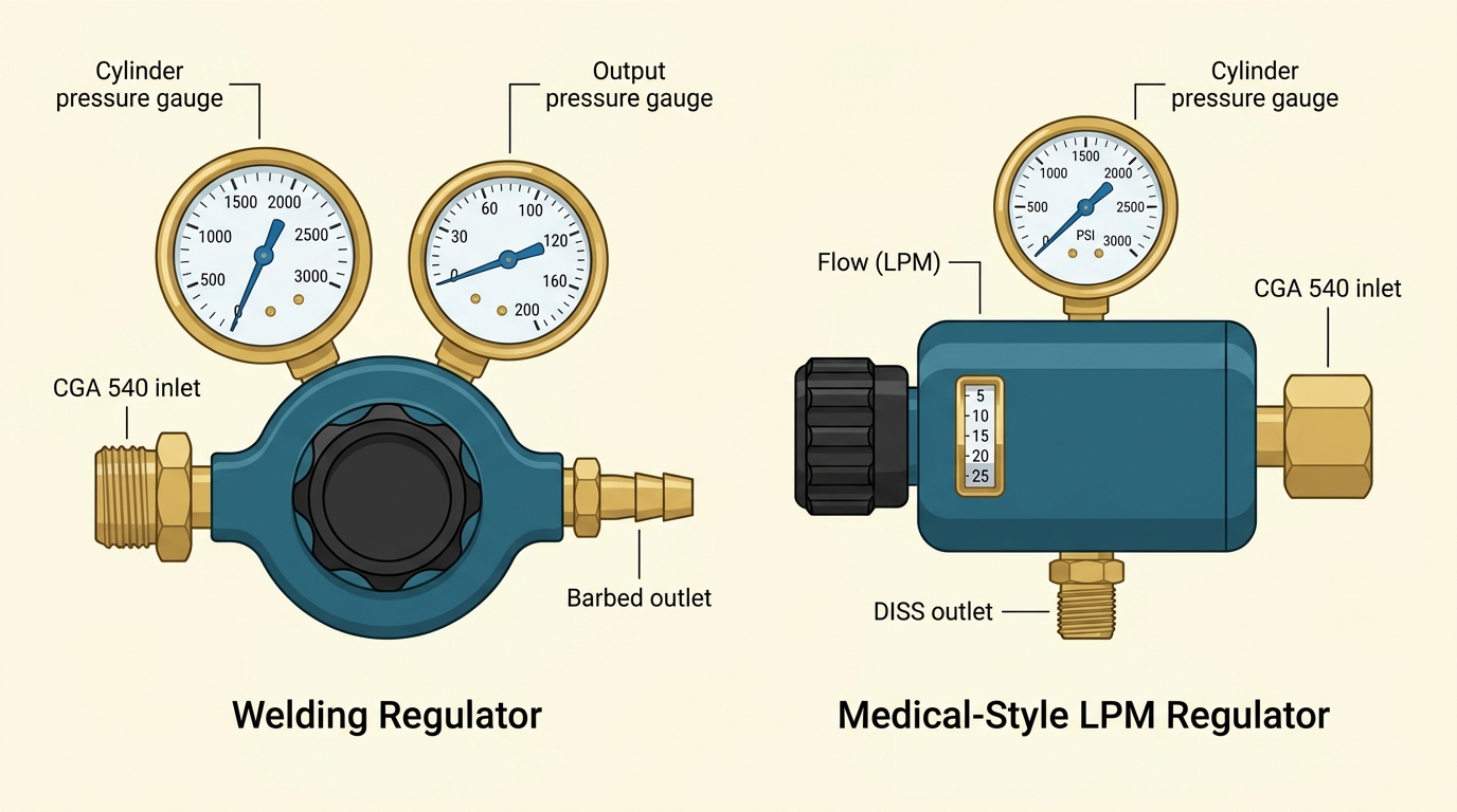 The two regulator types. Left: a standard welding regulator with two pressure gauges and a barbed outlet for standard tubing. Right: a medical-style LPM regulator with a flow dial calibrated in liters per minute and a DISS outlet for demand valves. Both have a CGA 540 inlet that threads onto the cylinder valve.