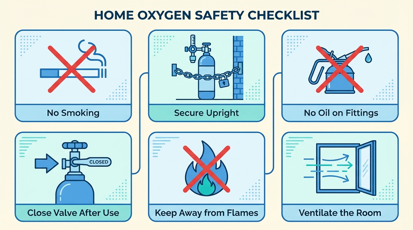 The most important safety consideration has nothing to do with whether your oxygen is labeled "medical" or "welding." Oxygen makes things burn faster and hotter. It doesn't burn on its own, but a spark that would fizzle in normal air can become a fully developed fire in an oxygen-enriched atmosphere. This is true of all oxygen, regardless of grade or label. The good news: patients have used oxygen at home safely for years by following simple rules. See the Safety at Home section below for the full list.