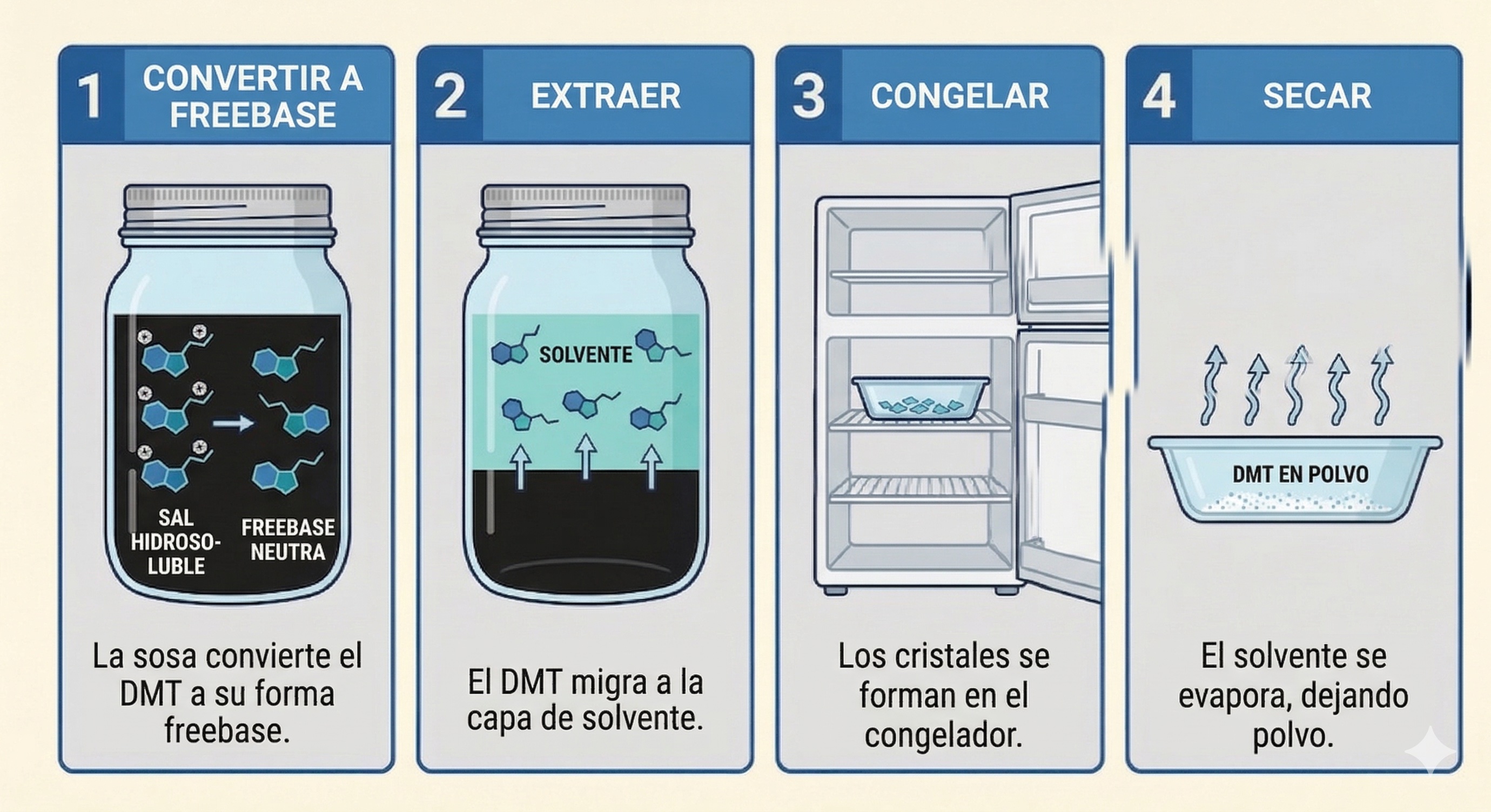 Las cuatro etapas de la extracción: convertir el DMT a freebase, extraerlo en el solvente, congelar para cristalizar y secar.