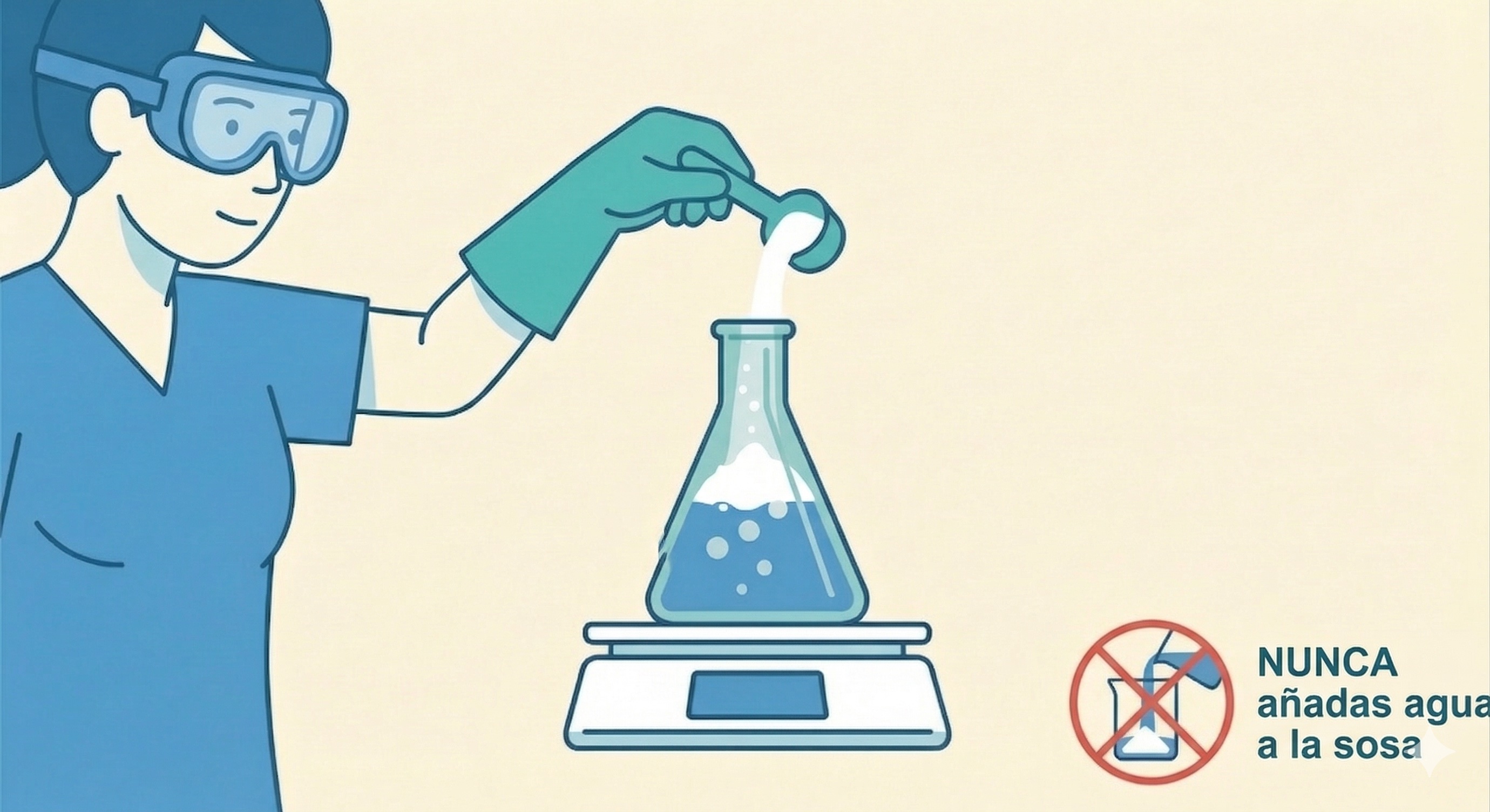 Disolver NaOH en agua genera mucho calor. Si lo viertes todo de una vez, la solución puede alcanzar temperaturas peligrosas (por encima de 50 °C), suficiente para agrietar el vidrio y salpicar líquido corrosivo. Una cucharada a la vez mantiene la temperatura controlable.