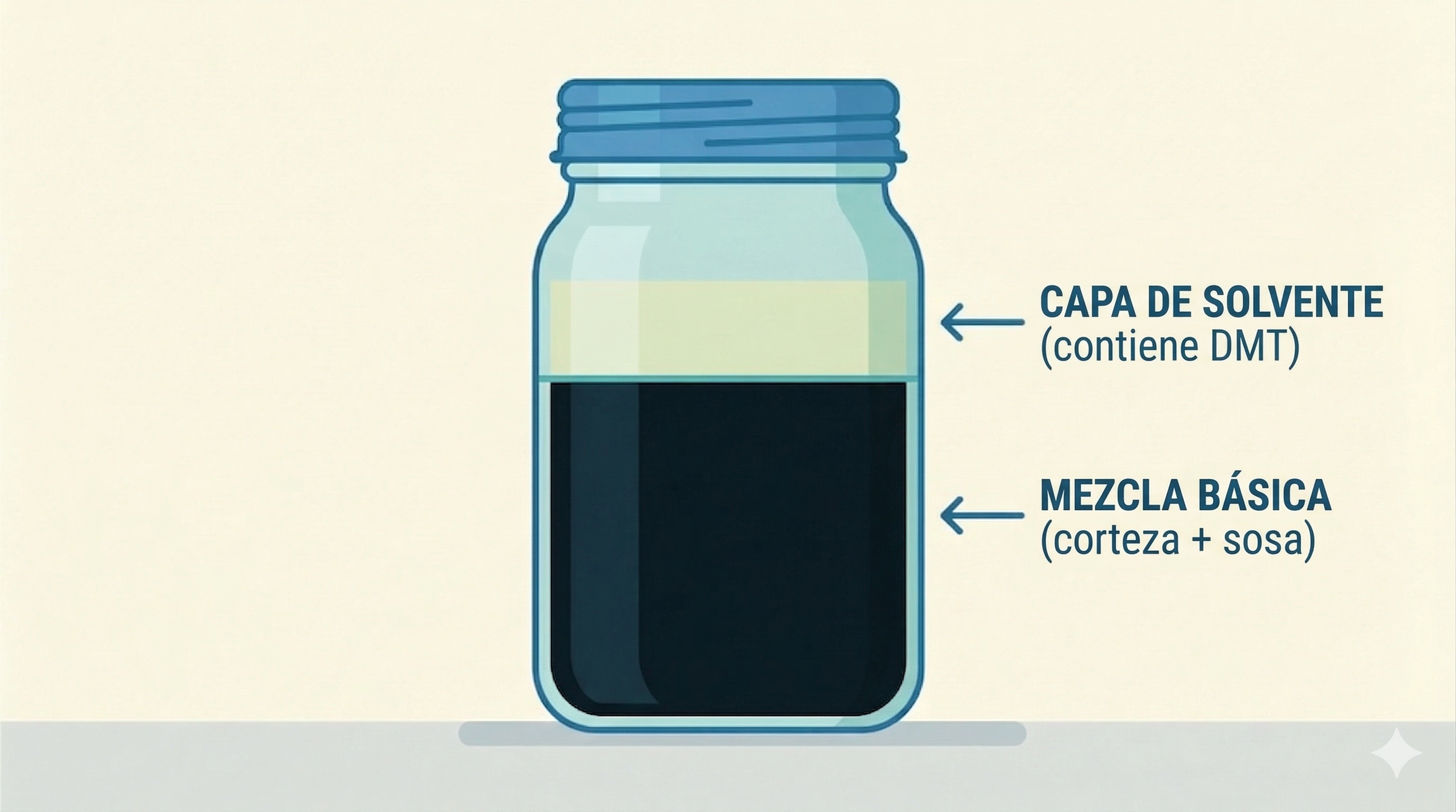 Dos capas limpias: el solvente transparente de arriba ahora contiene DMT disuelto. La mezcla básica oscura se asienta debajo.