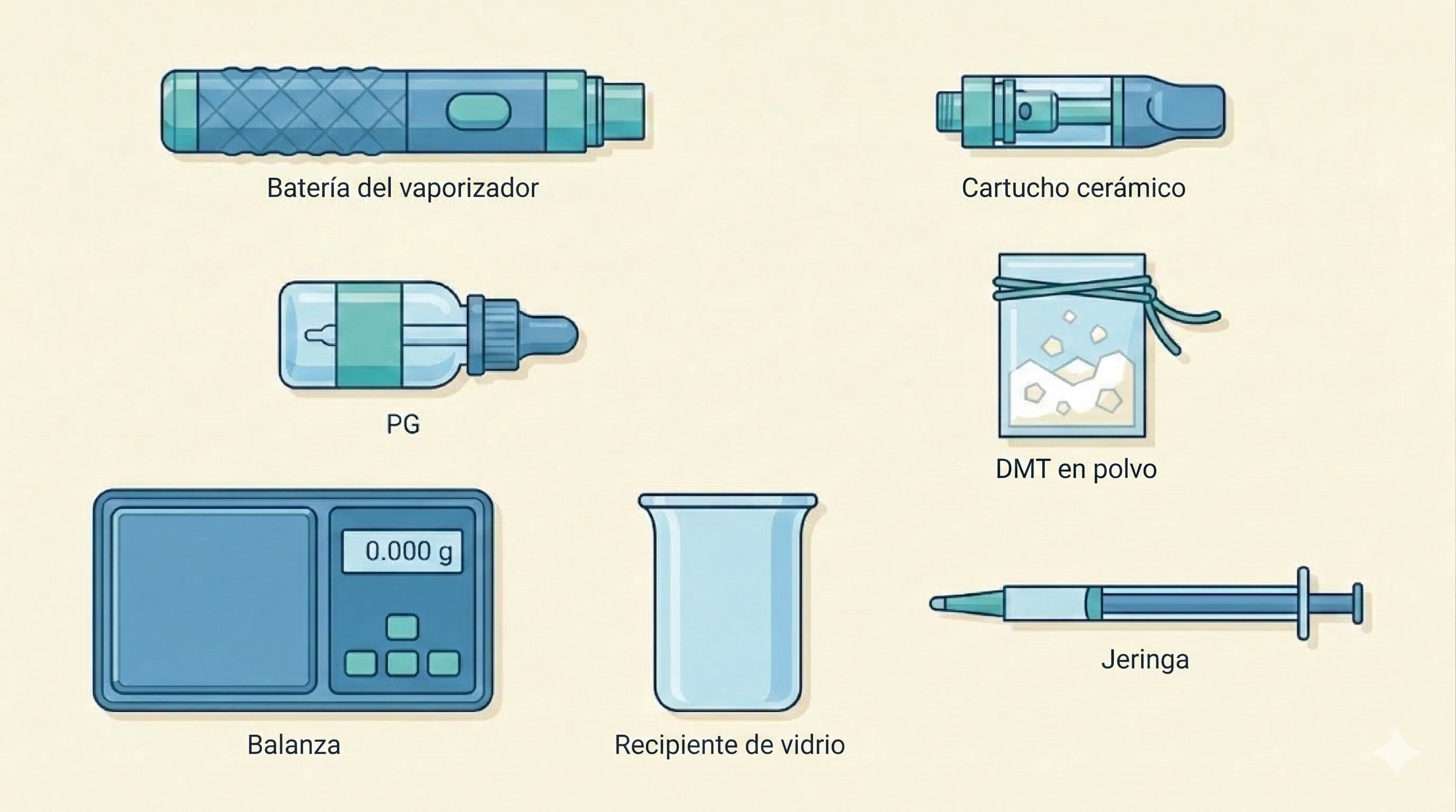 Necesitas siete cosas. La mayoría se pueden pedir en línea y llegan en pocos días. Todo excepto el DMT es equipo estándar y legal para vapear. No necesitas mencionar el DMT al comprar. Las tiendas de vapeo (en línea o presenciales), Amazon y eBay venden todos estos artículos.