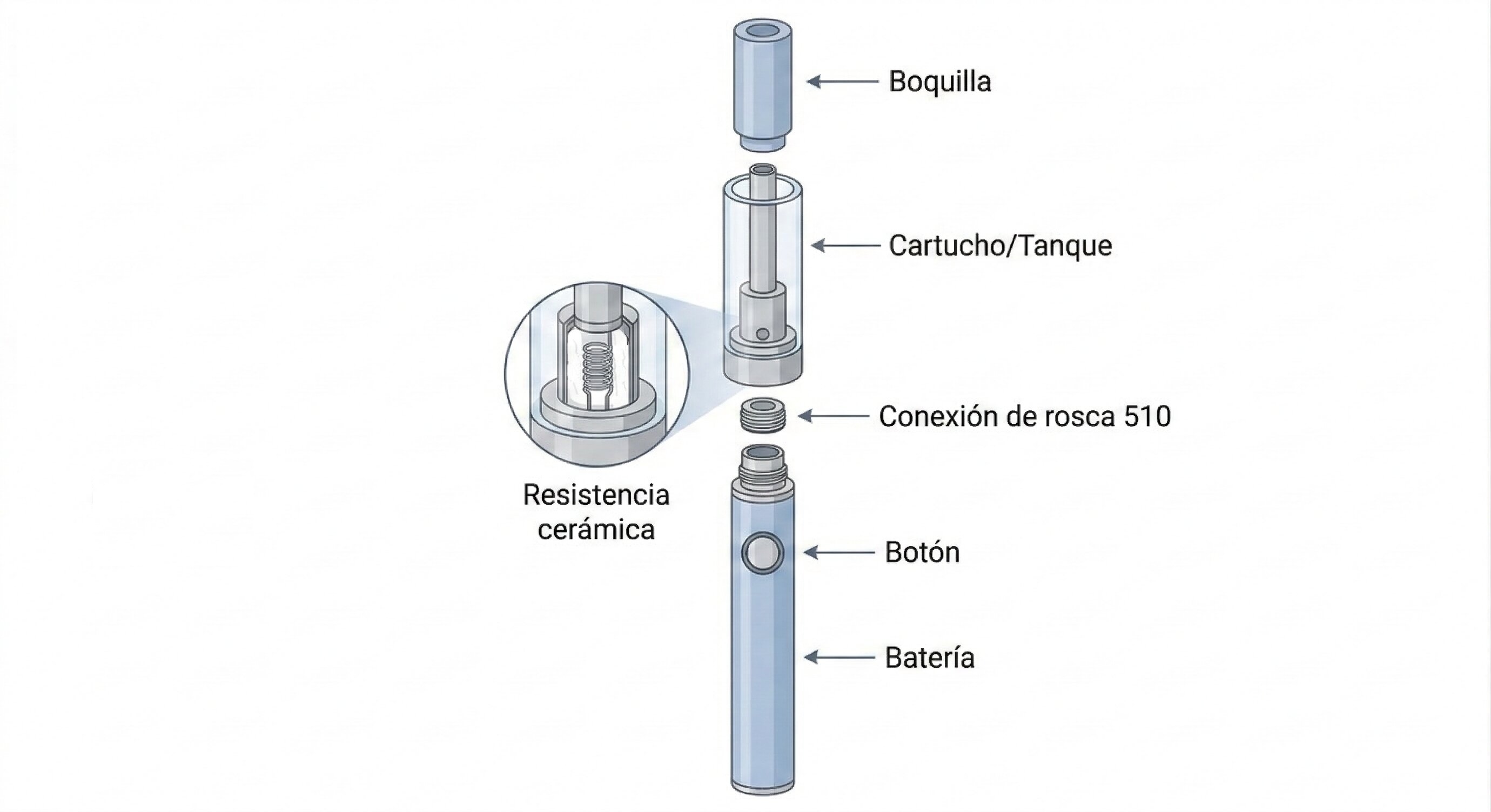 Las partes de un vaporizador. El cartucho se enrosca en la batería mediante una conexión de rosca 510 estándar.