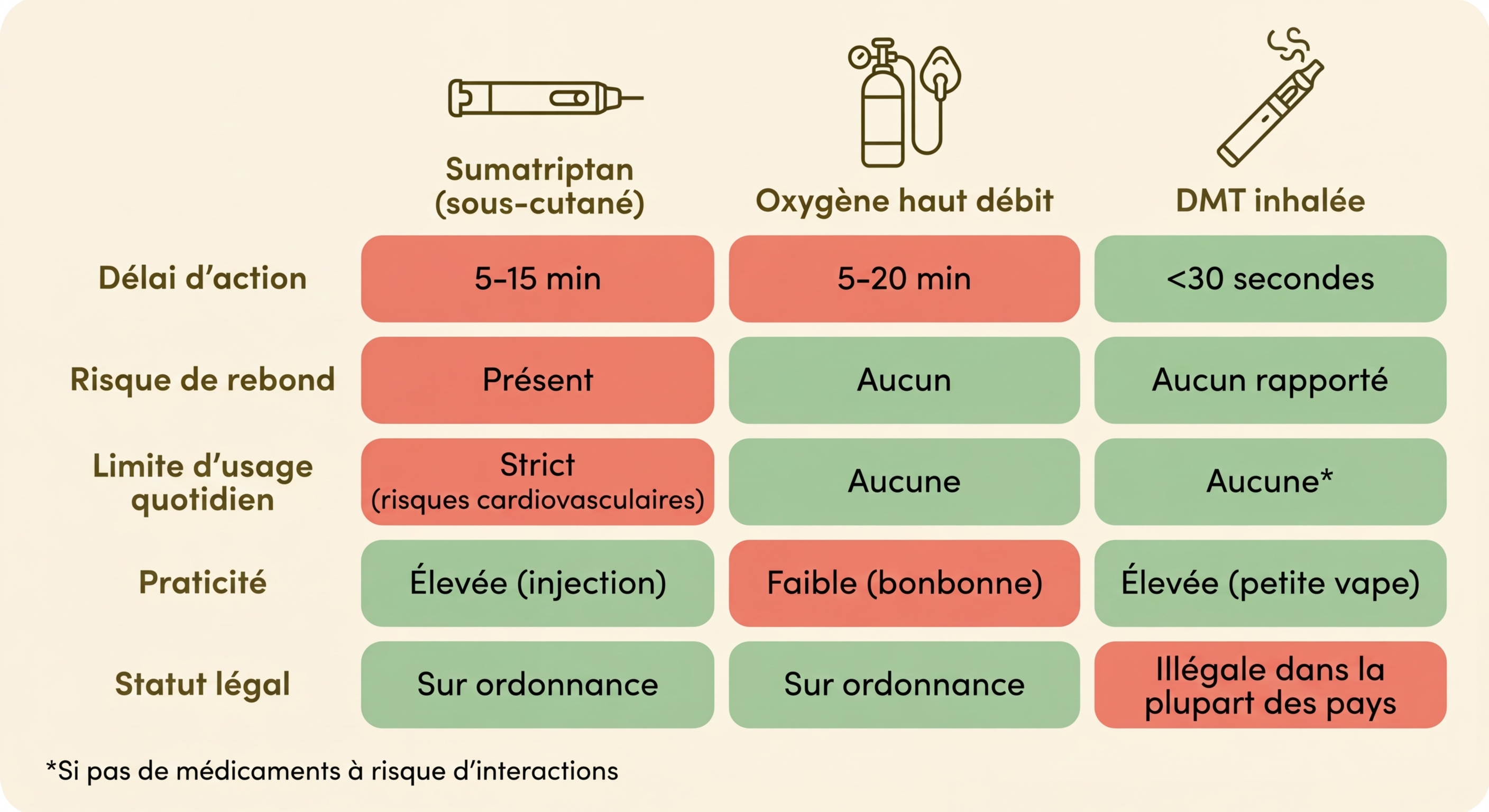 Comparaison des trois principales options pour stopper une crise d'AVF. L'oxygène à haut débit est le traitement de crise légal de référence. Si vous y avez accès, c'est une option éprouvée, seule ou en complément de la DMT.